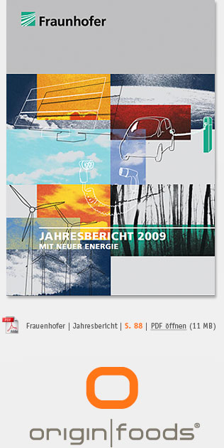 | Gesundheit und Wohlbefinden hängen nicht zu letzt von der richtigen Ernährung ab - diese Erkenntnis ist heute unbestritten. Die Origin Foods GmbH, im Juli 2009 als Gemeinschaftsunternehmen der Fraunhofer-Gesellschaft sowie wissenschaftlicher Mitarbeiter des Fraunhofer-!nstituts für Verfahrenstechnik und Verpackung IW und zweier externer Personen gegründet, hat sich das Ziel gesteckt, Gesundheit und Genuss bei Lebensmitteln zu verbinden. In Kooperation mit der Lebensmittelindustrie entwickelt das Unternehmen Nahrungsmittel, die auch generell einen mehr als positiven Effekt auf den menschlichen Stoffwechsel herbeiführen. Dabei ist die Intention bzw. Vorgabe, dass die entwickelten Lebensmittel präventiv gegen die signifikant steigenden Zivilisationskrankheiten wirken. |